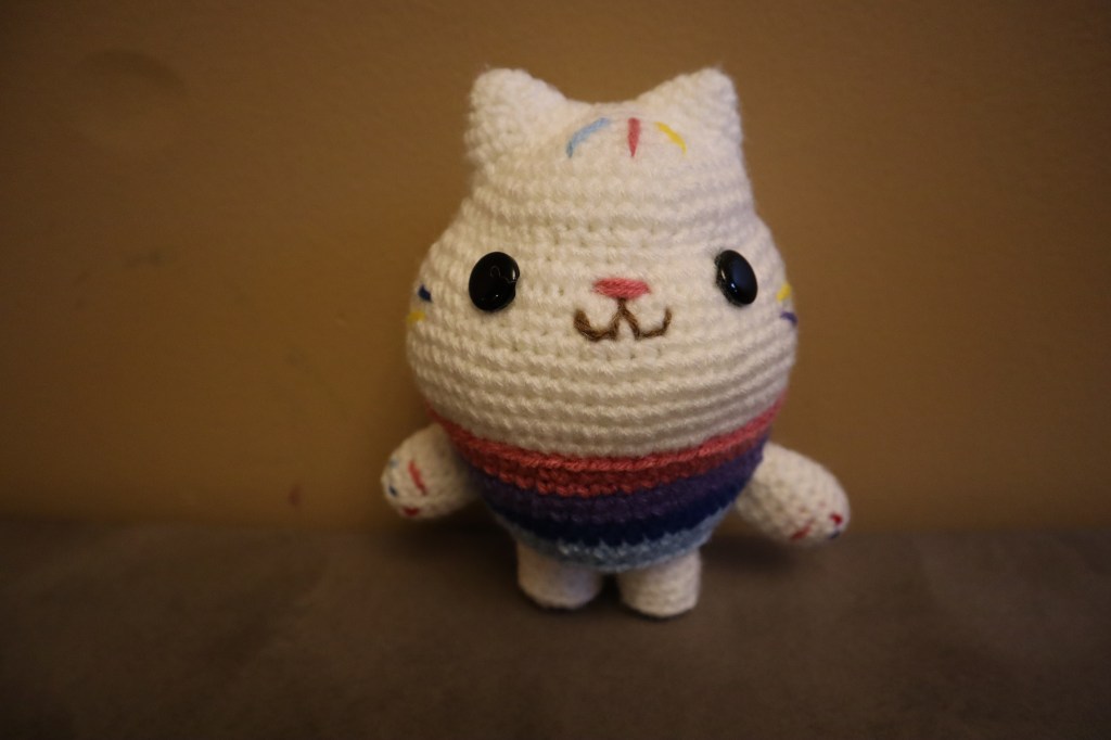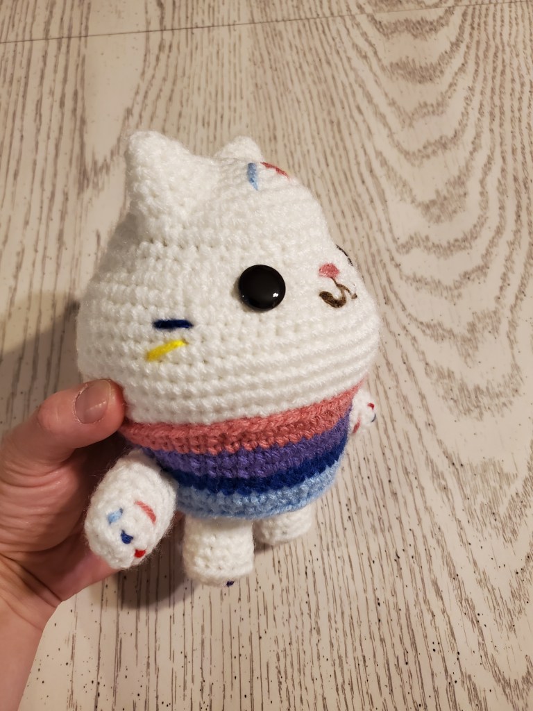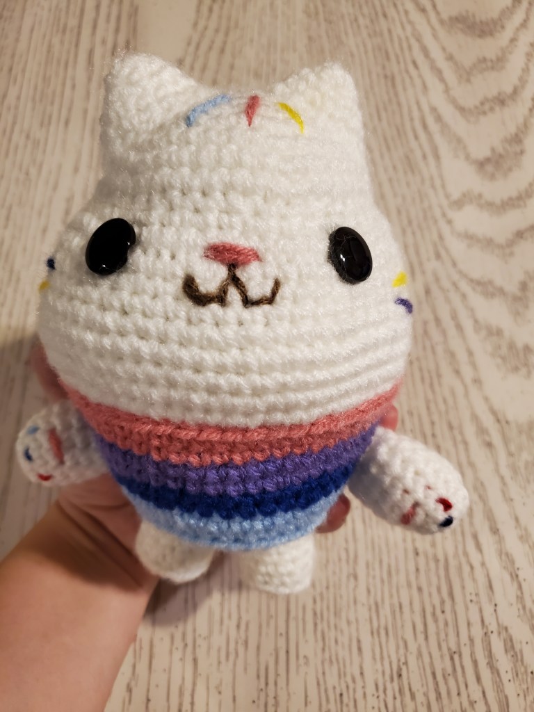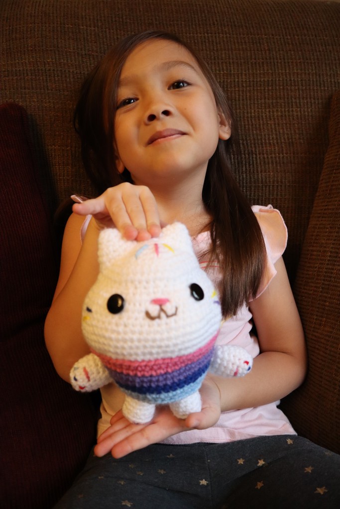 I made another character from Gabby’s Dollhouse. It’s Cakey! This cat is so adorable and my daughter loves him. Click here if you would like to purchase the pattern: Cakey Pattern.