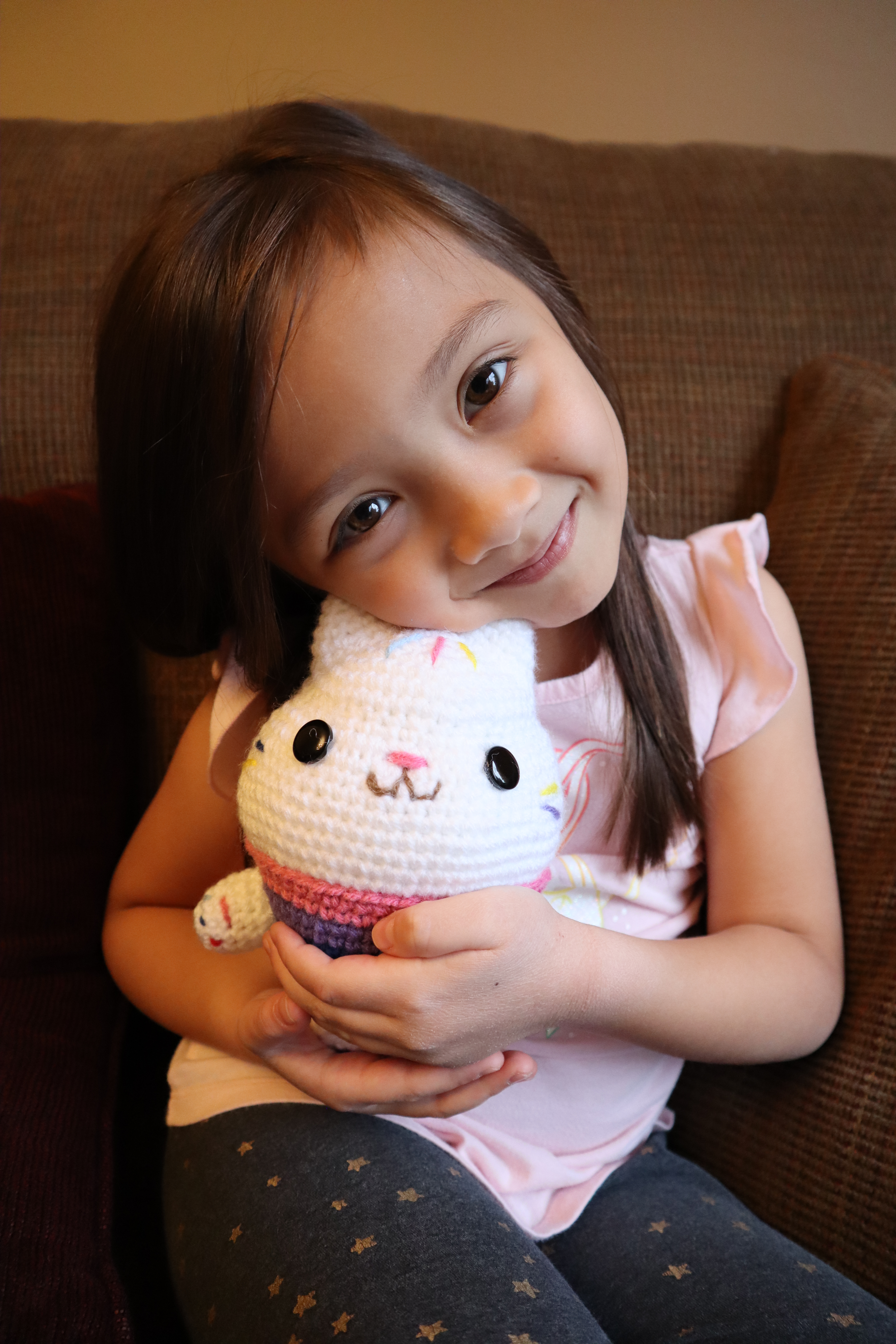 I made another character from Gabby’s Dollhouse. It’s Cakey! This cat is so adorable and my daughter loves him. Click here if you would like to purchase the pattern: Cakey Pattern.