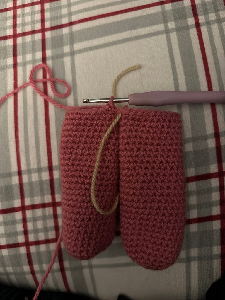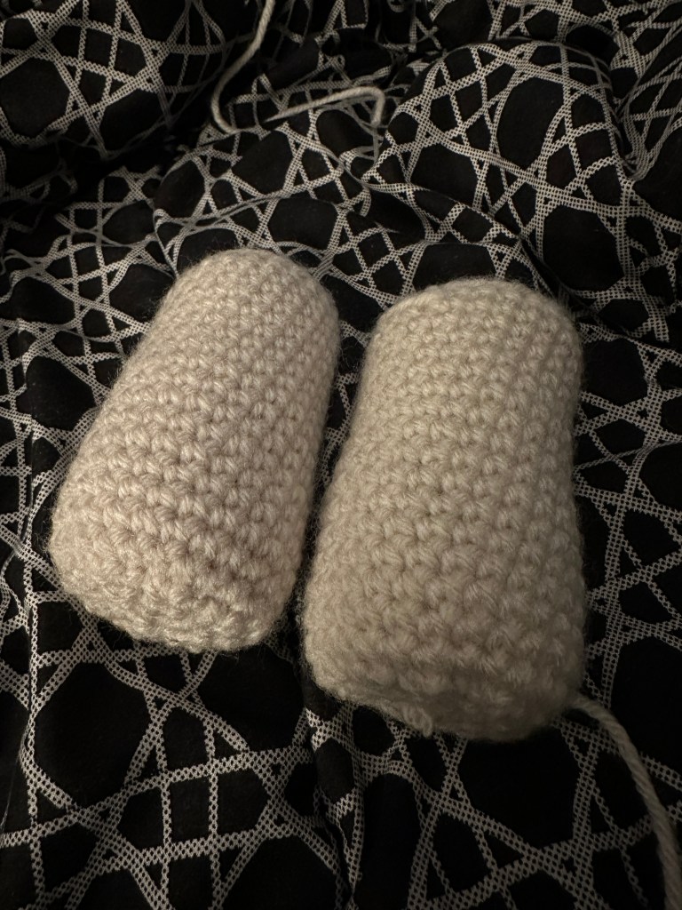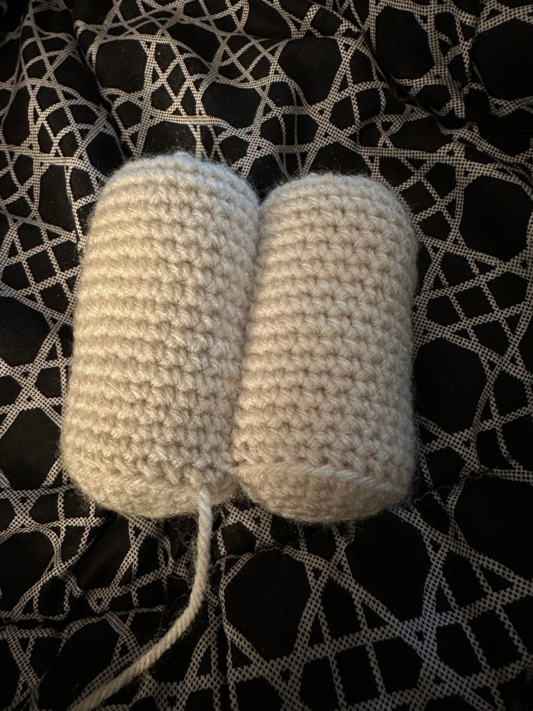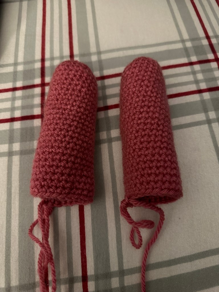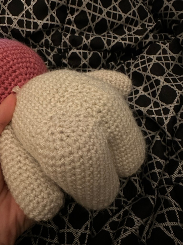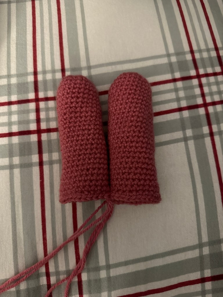 FO. Sew onto the hand. Make sure that you are sewing this on the opposite sides of the hands. You are sewing the thumb slightly towards the palm side.
