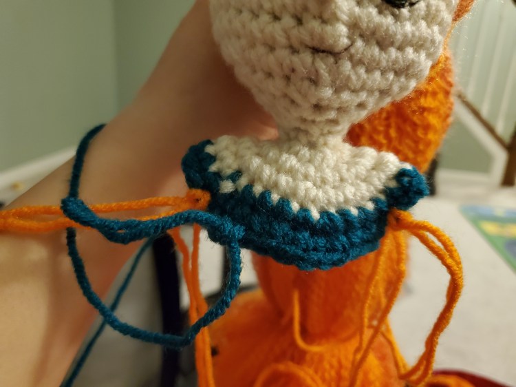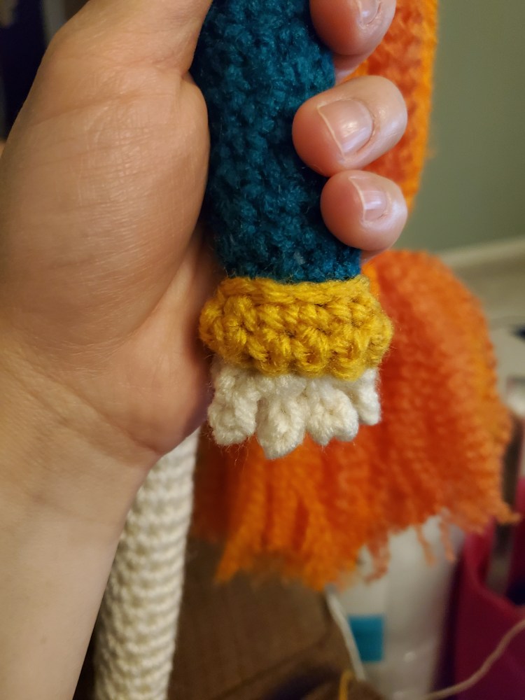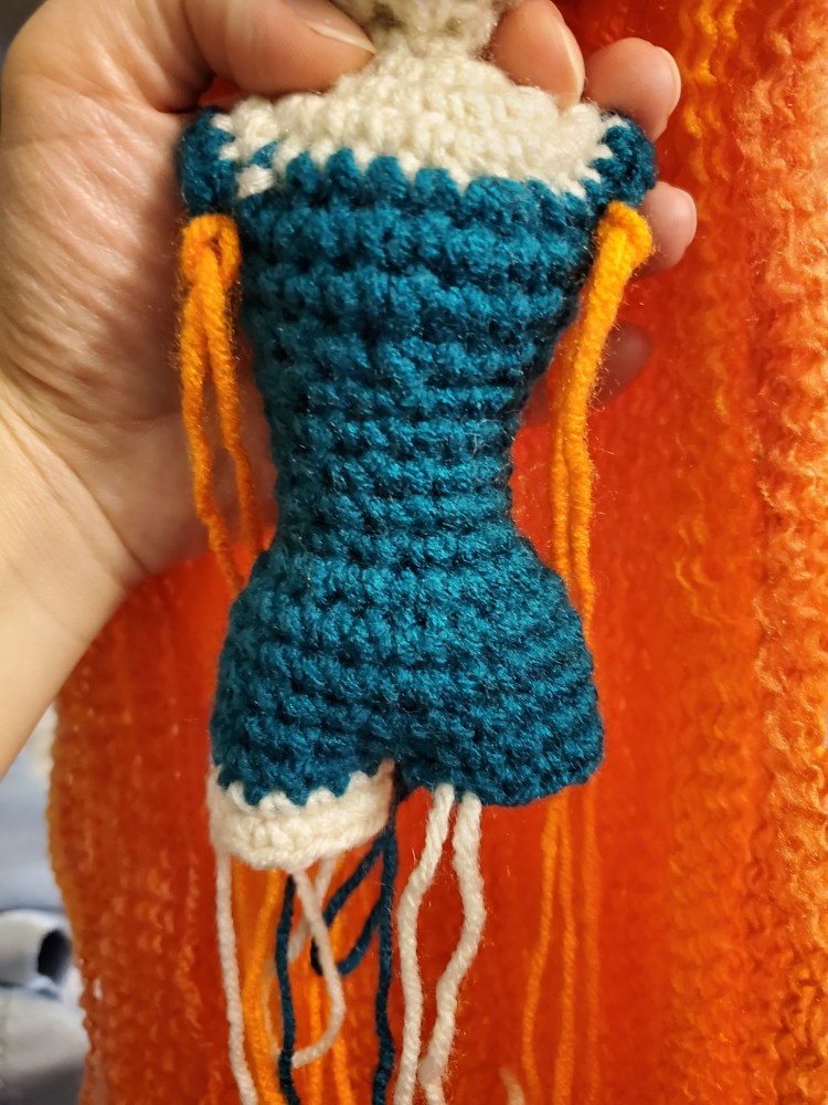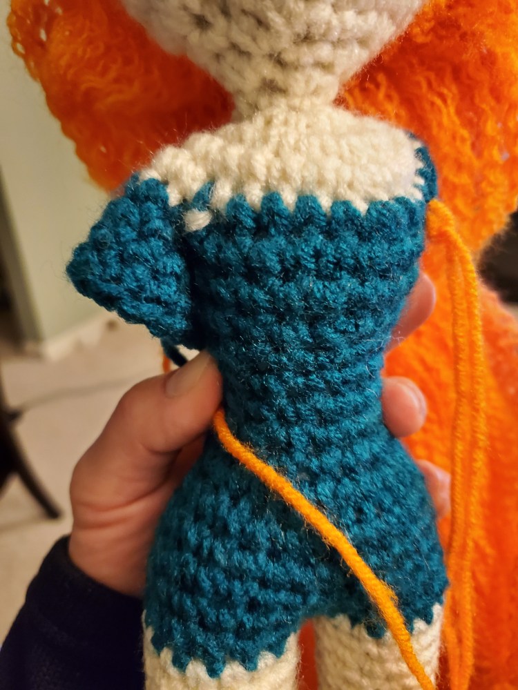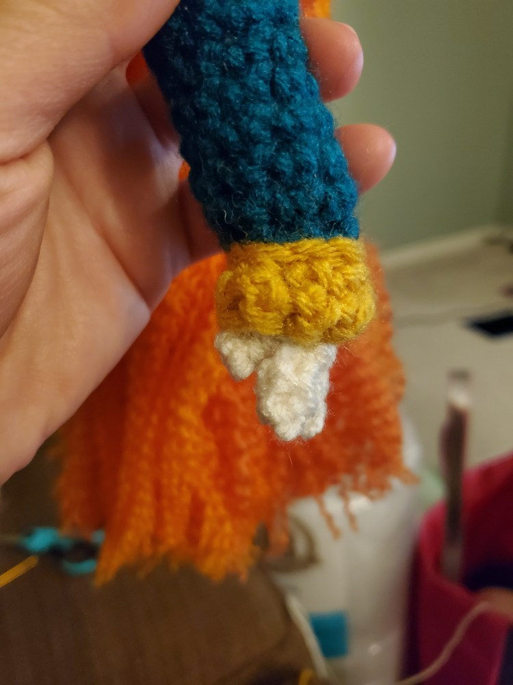 - Before you stuff the head, attach the yarn for the hair. You can unravel the hair if you like to give that curly hair effect. Or you can leave it as is. I unravelled it and used 2 different types of orange yarn to give it more dimension.