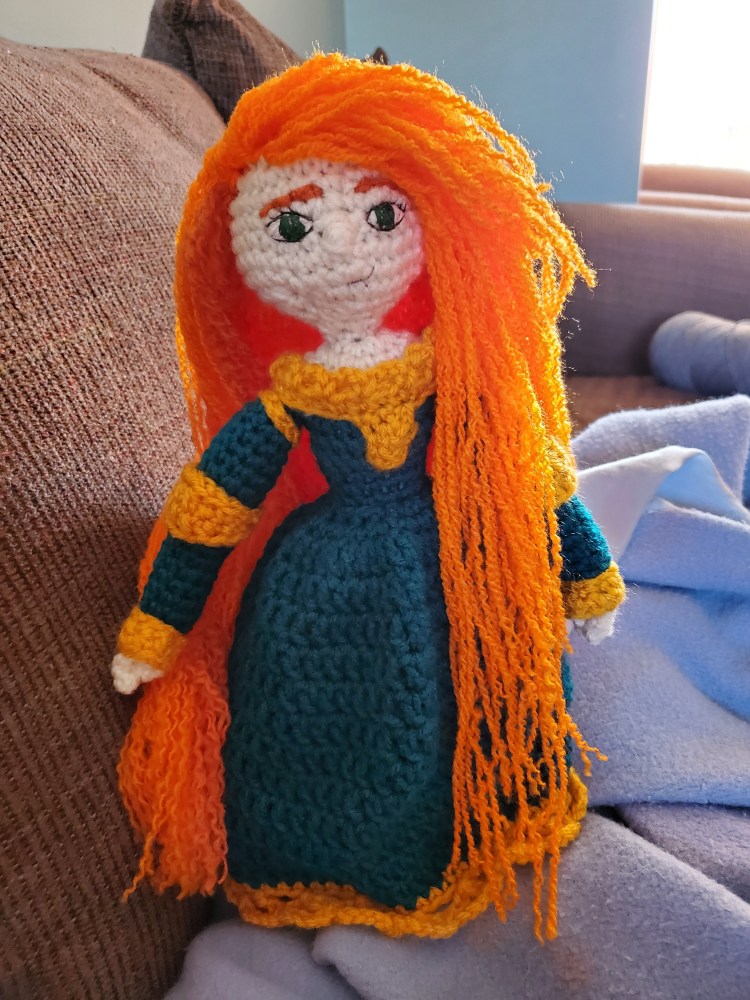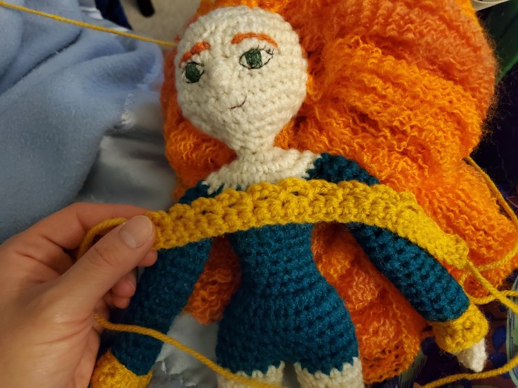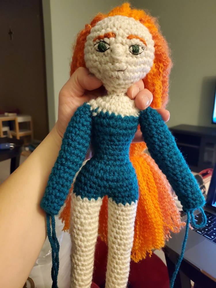 At this time you can trim the hair and add more pieces of yarn to reach your desired look. For my doll, I didn’t unravel all the pieces of yarn. Some of them have 2 strands. I also cut the front to give her bangs and styled her hair so it looks more natural. I left mine long but you can definitely cut it so it matches the length she has in the movie.