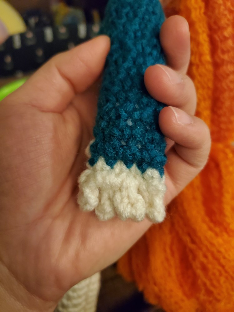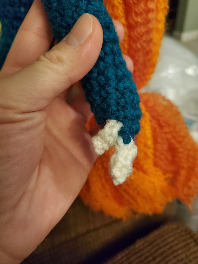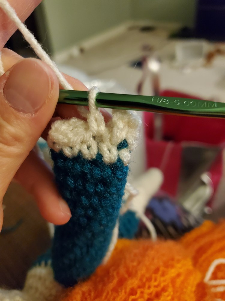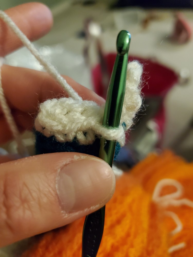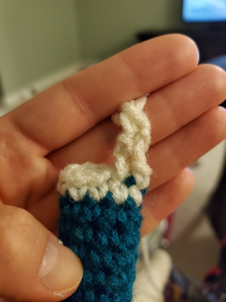 - For the thumb, join yarn where the thumb should be. The thumb should be 1sc wide and 3 rows long.