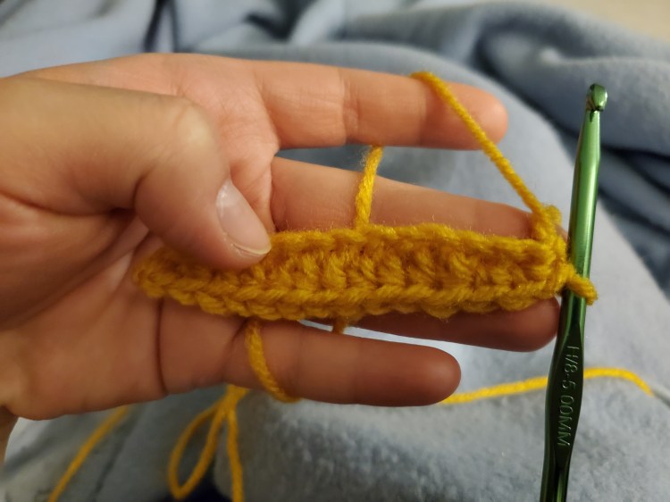 - 1sc in each chain starting in the second chain from the hook. (11)
