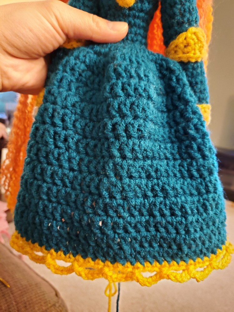 - This is optional but you can make the bottom of the dress fancier. (Chain 5. Skip 2 st. Sl st in next st.) x 14.