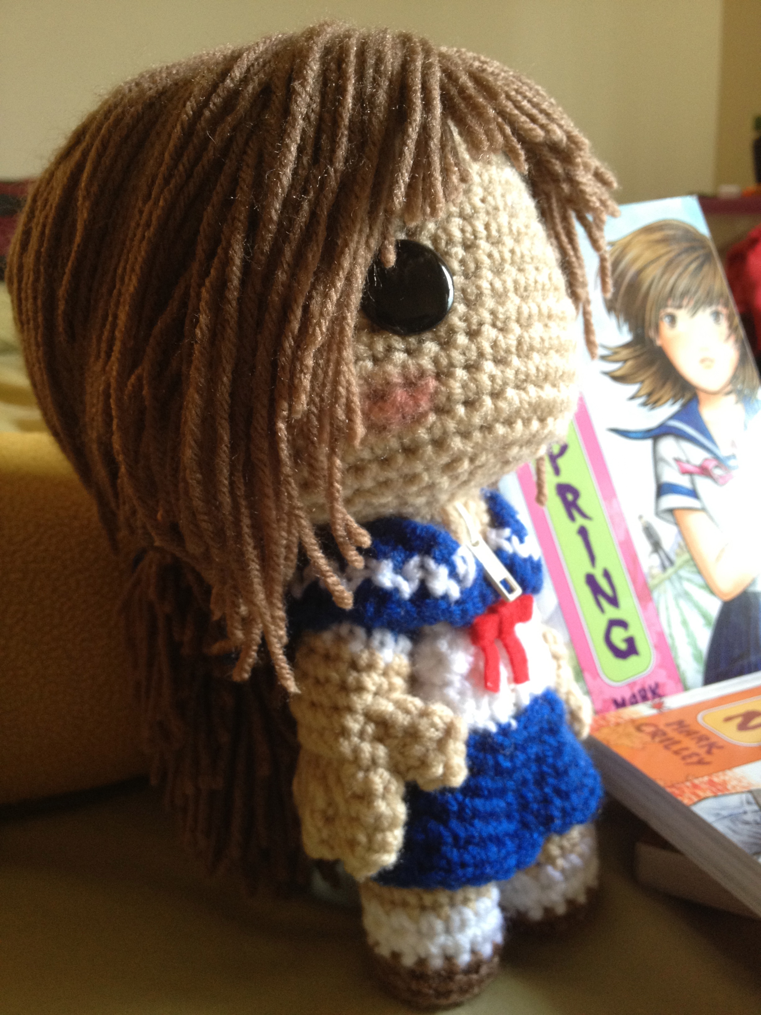 5.Miki’s hair is long, but with yarn, it is hard to work with it when it is that short so I decided to make her hair longer. I also used a piece of yarn to keep her hair tied so it woudn’t be all over the place.